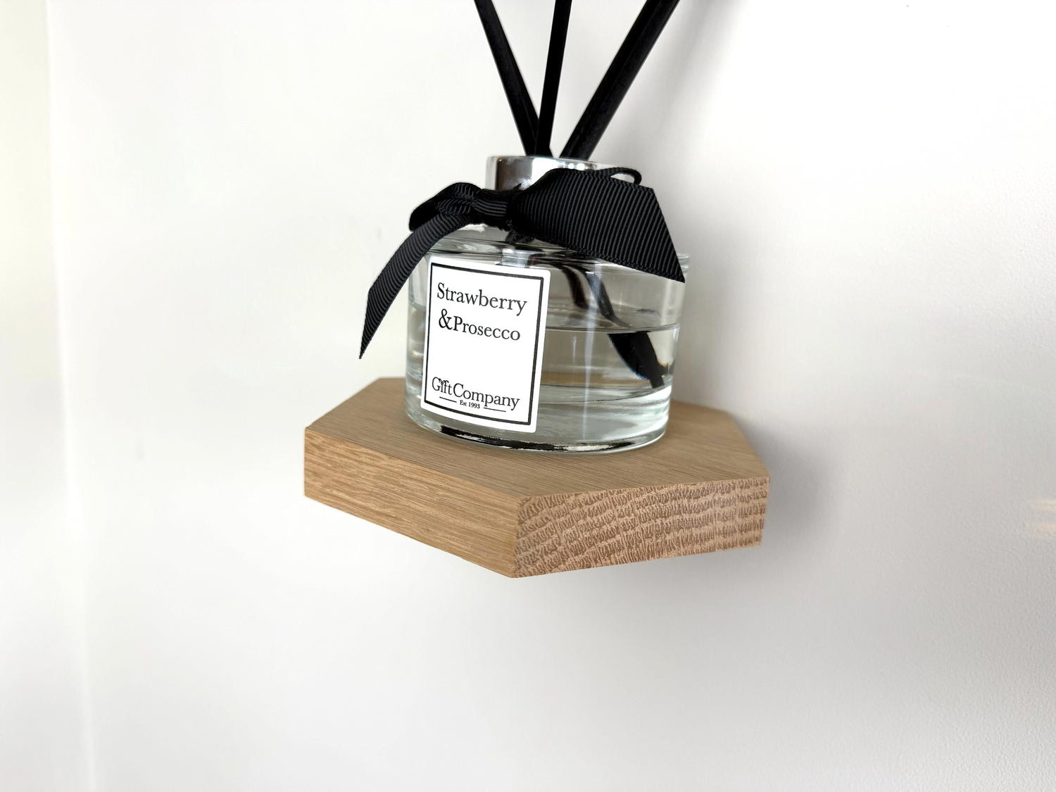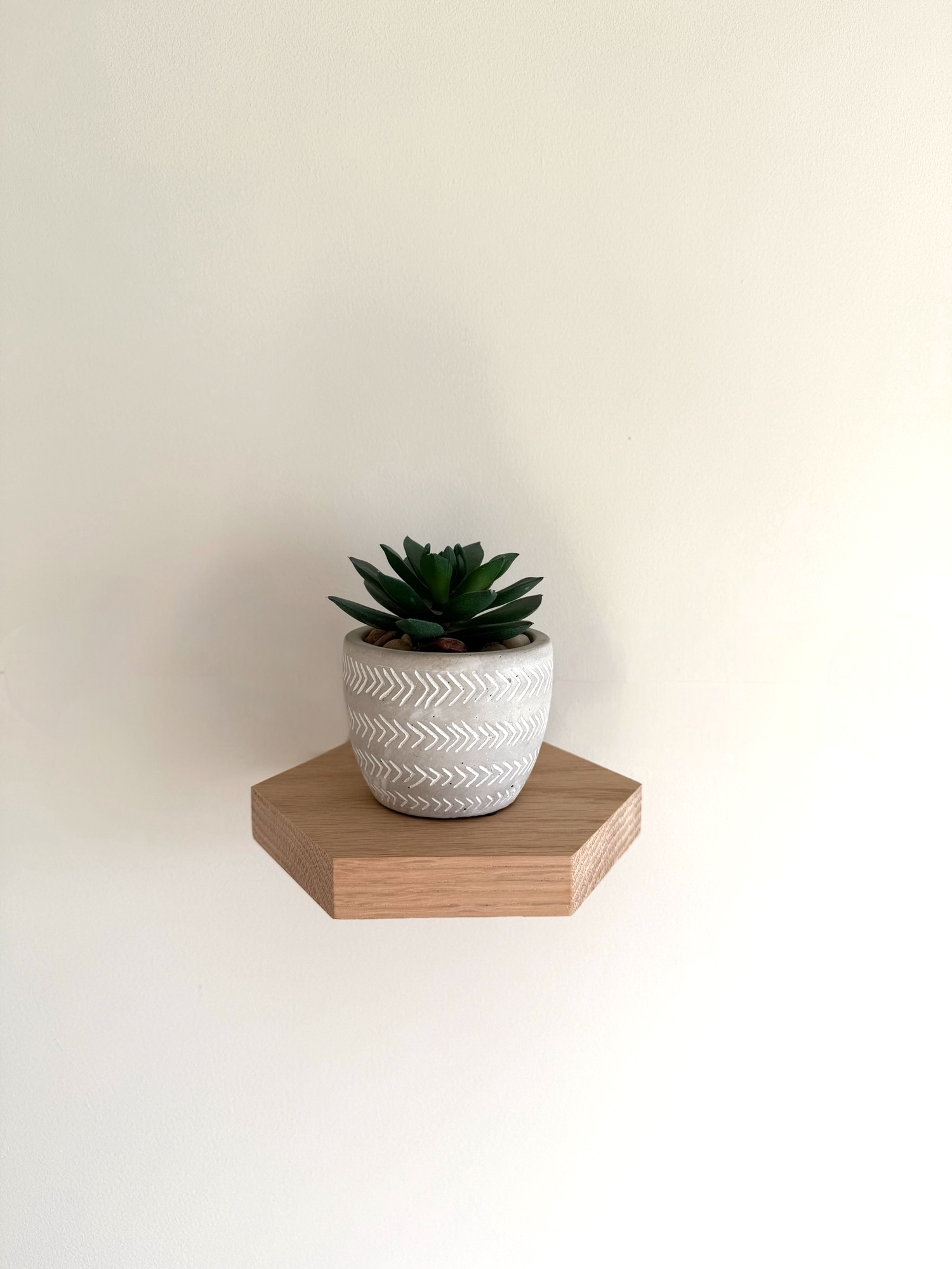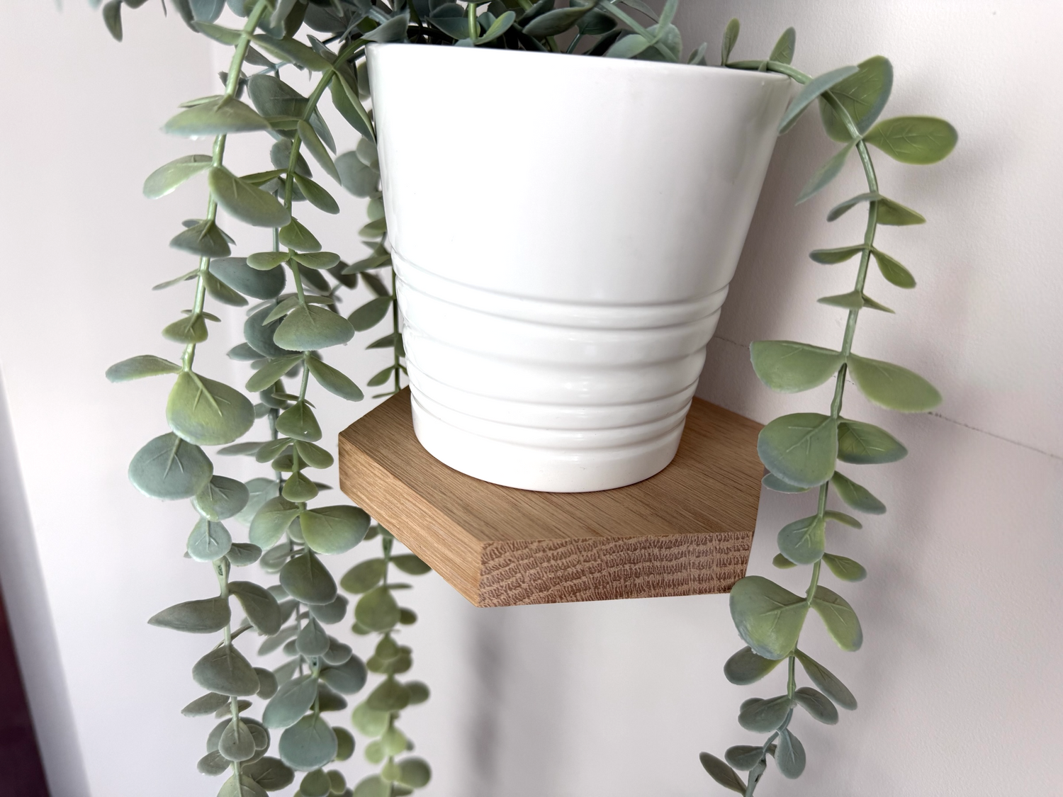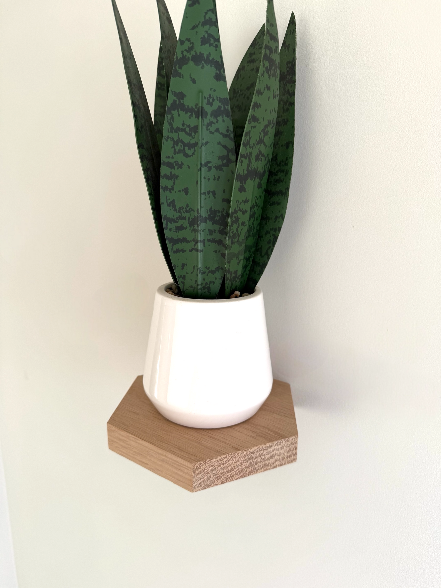 Small hexagon oak floating shelf with concealed fixings. The depth of this shelf is 15cm (point to point) ideal for many items around the home. This oak shelf is 2.2cm thick and has a smooth, clean, sanded finish.