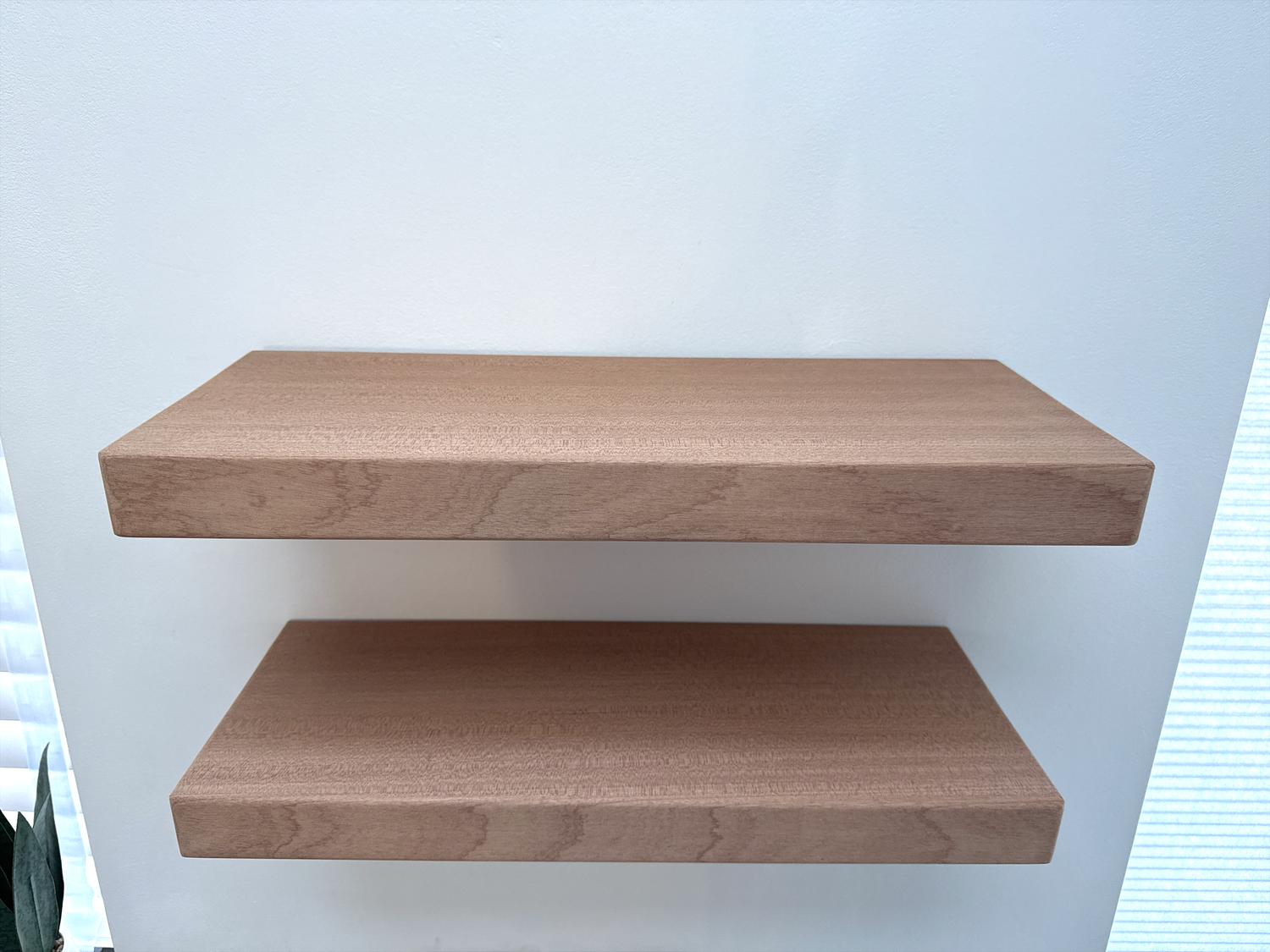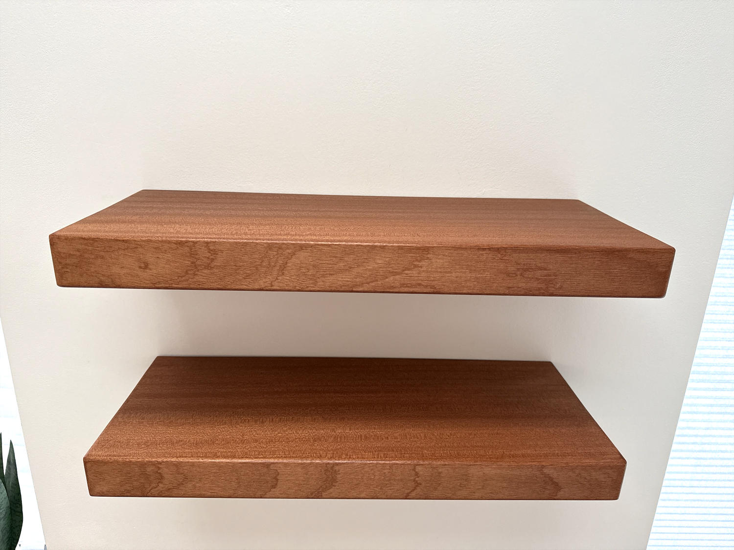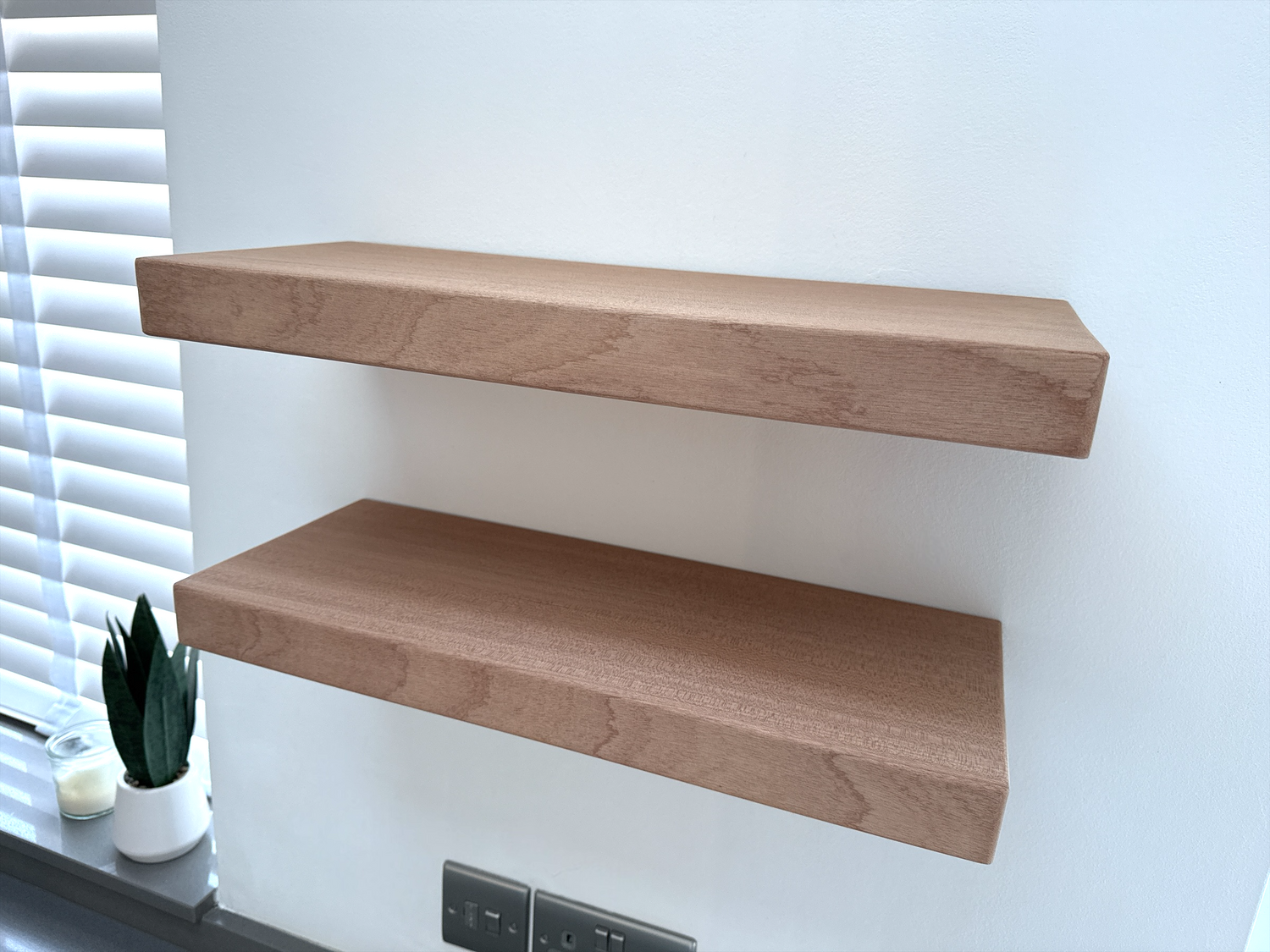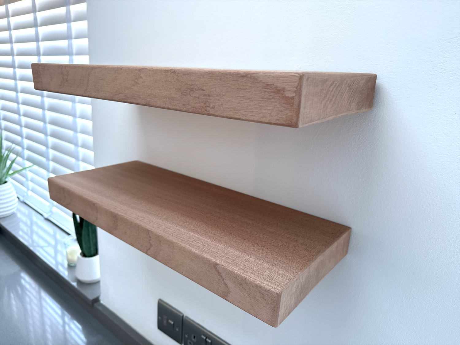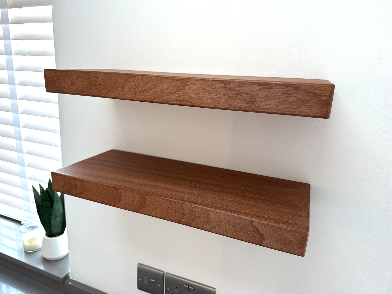 Smooth finish Sapele floating shelf. The depth of this shelf is 20cm, leaving plenty of space for your favorite items. This shelf is approx 4.5 thick and has a smooth, clean, sanded finish.